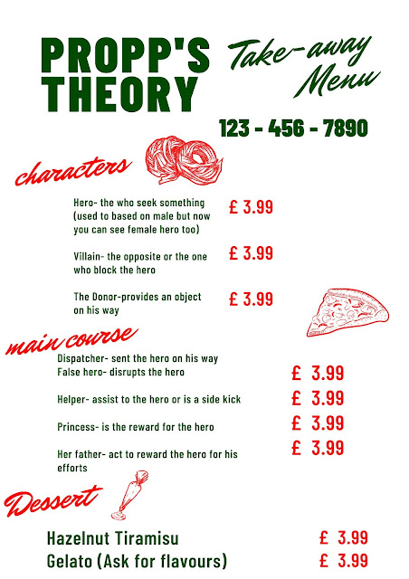 Reflection: This task is about propp's theory that I learnt about the characters in story, examples are hero, villain, the donor....... this help me know more the concept of the theory and how to put it in the horror film. One I can improve is I can research more about this theory